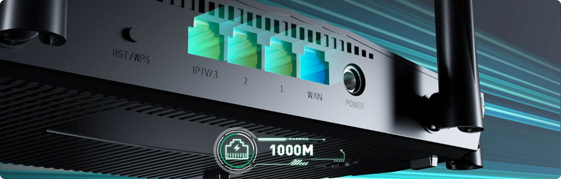 4 portas gigabit se aplicam a redes de banda larga abaixo de 1000 Mbps e oferecem velocidades máximas com fio, garantindo que todos os dados possam ser transferidos em alta velocidade sem qualquer interferência.