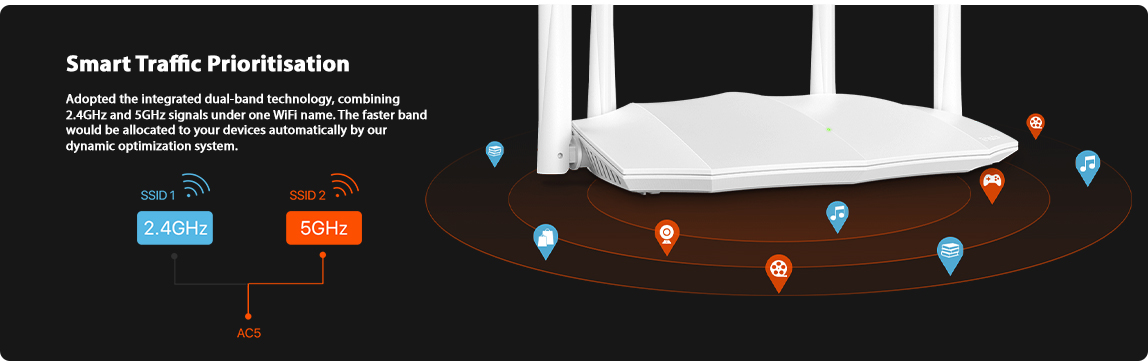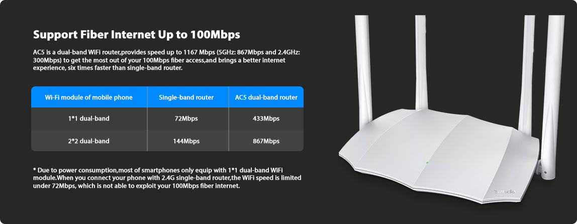 O AC5 é um roteador WiFi dual band AC1200, projetado para apartamentos de médio porte com acesso de fibra óptica de 100 Mbps. Ele oferece velocidades de WiFi de até 1167 Mbps (5 GHz: 867 Mbps e 2,4 GHz: 300 Mbps). Adota a tecnologia dual band integrada, combinando sinais de 2,4 GHz e 5 GHz em um único roteador WiFi. A banda mais rápida será alocada aos seus dispositivos automaticamente por nosso sistema de otimização dinâmica. Equipado com 4 antenas de alto ganho de 6 dBi e uma CPU de alto desempenho de 28 nm, ele proporciona uma melhor experiência de internet. O AC5 suporta o protocolo IPv6, o que pode reduzir o tempo de transmissão de dados e minimizar o atraso. Além disso, a função de gerenciamento remoto do aplicativo Tenda WiFi oferece a maneira mais fácil de gerenciar o AC5.