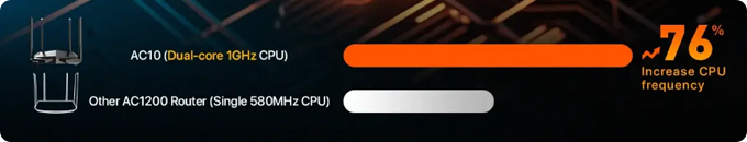 Comparado aos roteadores de banda única de 2,4 GHz, o roteador de banda dupla AC10 oferece uma velocidade combinada de até 1200 Mbps, com a banda de 5 GHz atingindo impressionantes 867 Mbps. Isso representa um aumento de 65% na velocidade em relação aos roteadores tradicionais de 300 Mbps.